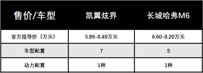 在年輕人最關(guān)注的售價(jià)方面,這兩款車的表現(xiàn)都足夠接地氣。其中,凱翼炫界的官方指導(dǎo)價(jià)為5.89萬(wàn)-8.49萬(wàn)元,共有7款配置車型可供消費(fèi)者選擇,具有不錯(cuò)的選擇空間。而哈弗M6官方指導(dǎo)價(jià)為6.60萬(wàn)-8.20萬(wàn)元,共有5款配置車型可供選擇。綜合來(lái)看,兩款車的售價(jià)都比較實(shí)惠,只是哈弗M6的門檻略微高一點(diǎn),而且選擇性也不及凱翼炫界。