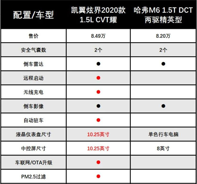在配置方面,兩款車也有一定的差距。以售價(jià)8.49萬(wàn)的凱翼炫界2020款1.5L CVT耀和售價(jià)8.2萬(wàn)的哈弗M6 1.5T DCT兩驅(qū)精英型為例。在安全配置上,兩款車都搭載了主副駕駛安全氣囊,在輔助駕駛配置上,兩款車都搭載了后倒車?yán)走_(dá)、倒車影像、定速巡航等功能。不同的是,凱翼炫界還配備了自動(dòng)駐車,但是哈弗M6卻沒(méi)有,在等紅綠燈的時(shí)候,這個(gè)配置還是非常實(shí)用的。除此之外,凱翼炫界還配備了前排無(wú)線充電、遠(yuǎn)程啟動(dòng)、內(nèi)置行車記錄儀等眾多十分實(shí)用的配置,這都是哈弗M6并未配備的。