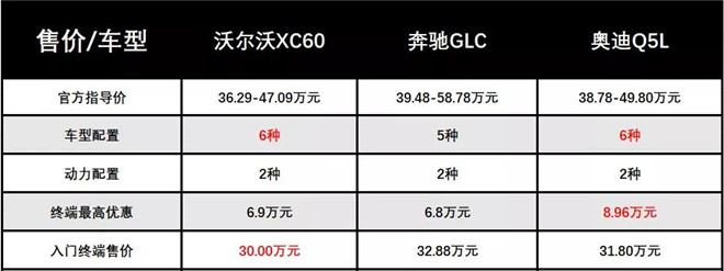 眾所周知,越是成功人士就越會(huì)精打細(xì)算。因此,事業(yè)小有成就的人群,在買車時(shí)更會(huì)計(jì)算車輛的性價(jià)比,從而選擇一款真正適合自己的車。這三款車的售價(jià)區(qū)間有一定的差距,但在優(yōu)惠完后,有不小的重疊區(qū)間。沃爾沃XC60的官方指導(dǎo)價(jià)為36.29萬-47.09萬元,經(jīng)銷商提供至高6.9萬的優(yōu)惠;奔馳GLC官方指導(dǎo)價(jià)為39.48萬-58.78萬元,經(jīng)銷商最大優(yōu)惠幅度為6.8萬;而奧迪Q5L官方指導(dǎo)價(jià)為38.78萬-49.80萬元,經(jīng)銷商提供至高8.96萬的優(yōu)惠。從售價(jià)來看,沃爾沃XC60和奧迪Q5L優(yōu)惠后的售價(jià)區(qū)間均在30-40萬之間,而奔馳的高配車型則到50萬以上,相比而言,在售價(jià)上奔馳并不占優(yōu)勢。