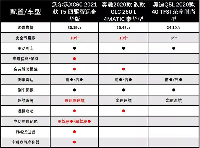 在配置方面,三款車也拉開很大差距。雖然沃爾沃XC60的售價(jià)在三車之間不是最高也不是最低,但是其配置水平卻是最突出的。以實(shí)際終端售價(jià)35萬左右的車型為例,我們選擇了沃爾沃XC60 2021款T5四驅(qū)智遠(yuǎn)豪華版、奔馳2020款改款GLC 260 L 4MATIC豪華型以及奧迪Q5L 2020款40TFSI榮享時(shí)尚型。在安全配置上,三款車均配備了主副駕駛、前排側(cè)、前后排頭部安全氣囊,但是XC60和GLC還有配有膝部氣囊,而Q5L卻沒有搭載。在主動(dòng)安全配置上,三款車均搭載了主動(dòng)剎車,XC60還搭載了車道偏離/保持、疲勞駕駛提醒,而GLC僅加裝了疲勞駕駛提醒。在駕駛輔助配置上,三款車均搭載了前后倒車?yán)走_(dá)、倒車影像、而XC60還搭載了自適應(yīng)續(xù)航系統(tǒng)、4種駕駛模式,奔馳GLC和奧迪Q5L則均使用了定速巡航和3種駕駛模式。
