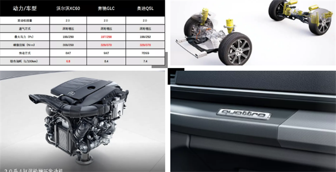 在動(dòng)力配置上,三款車的表現(xiàn)相差不大,皆搭載2.0T渦輪增壓發(fā)動(dòng)機(jī),并以高低功率分為兩種動(dòng)力選擇。其中,沃爾沃XC60兩種動(dòng)力配置均匹配8AT變速箱,最大馬力分別為190Ps和250Ps;奔馳GLC匹配9AT變速箱,最大馬力分別為197Ps和258Ps;奧迪Q5L則匹配7速雙離合變速箱,最大馬力分別為190Ps和252Ps。相比下來,三款車的動(dòng)力水平十分相近,在實(shí)際的駕駛中,沃爾沃的四種駕駛模式能夠更好的滿足消費(fèi)者的駕駛需求。