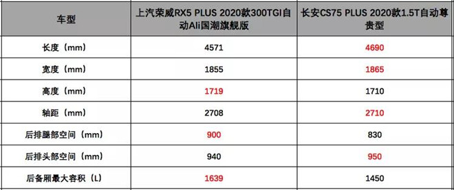 以上圖來看,作為緊湊型SUV,兩款車均處于同級水平,相差不大。雖然長安CS75PLUS的車身長、寬、軸距略微領先,但在實際乘坐體驗以及駕乘空間方面,榮威RX5 PLUS的表現毫不遜色,甚至有反超態勢。比如,榮威RX5 PLUS的后排腿部空間優勢明顯,達到900mm,即使是大長腿也能隨心安放,對于老人或者帶小孩的乘客更加便捷,寬敞又不失舒適感。最重要的是,榮威RX5 PLUS對于空間的利用率極高,后備廂最大容積可達1639L,無論是自駕游還是購物放置均可,且其后備廂離地高度設計也很合理,取放物品非常方便。