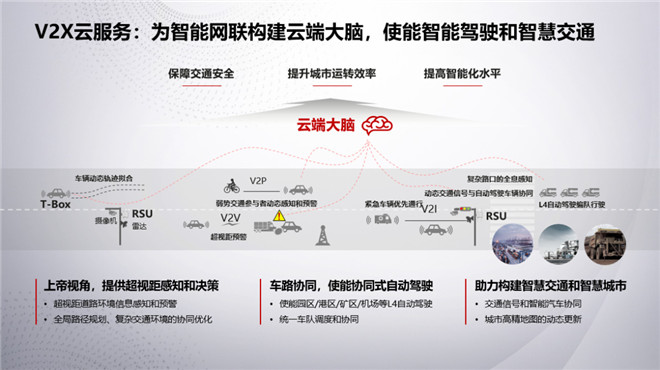 旨為智能網聯構建一個云端大腦,除基礎的V2X聯接使能、設備管理、事件管理、數據管理等能力外,還結合5G、AI、大數據等技術,構建上帝視角,實現對人、車、路、環境等要素的超視距感知和全局路徑規劃、策略優化等能力。