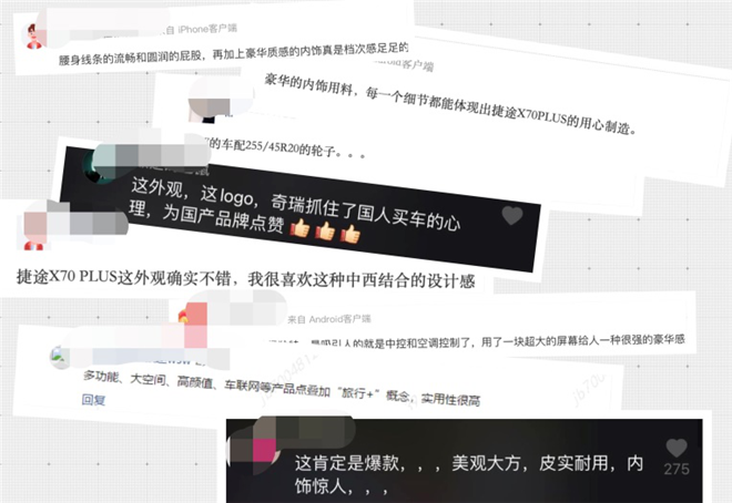 從評論的時間來看,在車輛上市前討論最多的是“新車賣多少錢?”、“等不及了,何時公布價格?”、“十萬能買到嗎?”等等,大家對于新車價格依然是非常敏感的。不過,在公布價格之后,捷途X70 PLUS 7.7萬元的起售價可以說打動了此前一直喜歡奇瑞捷途但又搖擺不定擔心超預算的消費者,不少網友留言表示“這么精致的外觀和內飾,不到十萬就可以提,知足了吧”、“十萬落地這么大SUV還要什么自行車”等等。奇瑞捷途用越級的品質與充滿誠意的價格吸引了眾多中型SUV消費者的青睞。