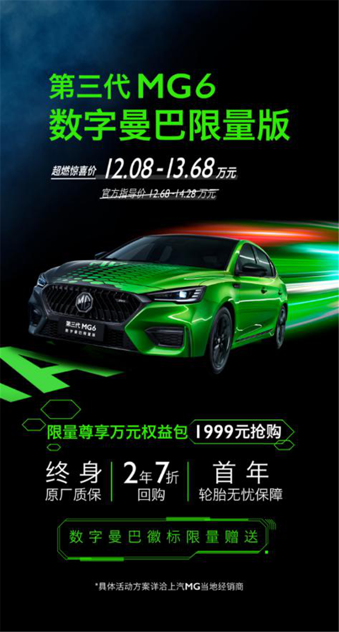 第三代MG6數字曼巴限量版共推出三款車型,官方指導價12.68萬元-14.28萬元,在6000元紅包優惠的基礎上,超燃驚喜價僅需12.08萬元-13.68萬元,現在購車還可1999元搶“限量尊享萬元權益包”,包括終身原廠質保、2年7折回購、首年輪胎無憂保障;第三代MG6 PHEV數字曼巴限量版共推出兩款車型,官方指導價16.78萬元-17.58萬元,在6000元紅包優惠的基礎上,超能先享價僅需16.18萬元-16.98萬元,購車即可享終身電池質保。消費者購買第三代MG6數字曼巴限量版車系還可享專屬限量徽標。