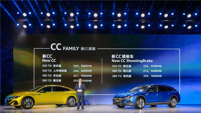新CC提供330 TSI炫目版、330 TSI上市特別版、380 TSI奪目版、380 TSI耀目版四款車型,售價區間為24.99-29.29萬元;新CC獵裝車提供330 TSI獵目版、380 TSI獵心版、380 TSI獵風版三款車型,售價區間為25.69-29.99萬元。
