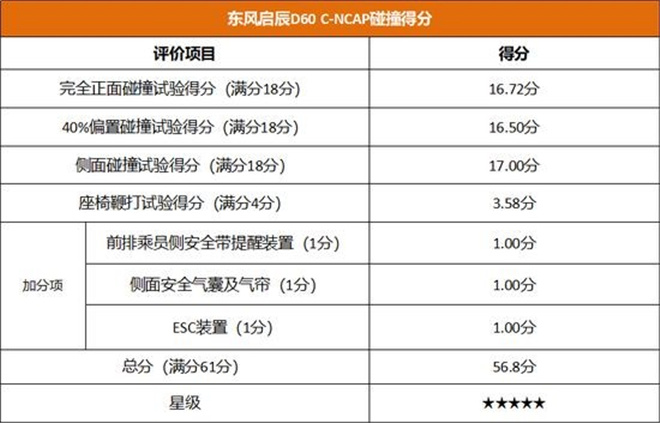 啟辰D60不僅連續(xù)兩年獲得汽車之家中國車系質(zhì)量排行榜第一名,更憑借超強節(jié)油能力,獲得2020年CCRT中國工況油耗評價結(jié)果(轎車)排行榜第一名的榮譽。安全方面,啟辰D60在中國汽車技術(shù)研究中心2018年第二批的C-NCAP碰撞中,以56.8的高分榮獲五星安全認(rèn)定(滿分61分),名列top1。