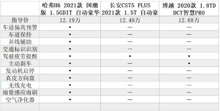 買車總是繞不開配置這個話題,配置是價值的體現,而且影響著用車體驗度。那么三款車型的配置如何呢?出于公平性的原則,筆者分別從三款車型中選出了一個代表車型做對比,它們分別為哈弗H6國潮版1.5GDIT自動豪華版(售價12.19萬)、長安CS75 PLUS 1.5T自動豪華型(售價12.49萬)、博越1.5TD自動智慧PRO(售價12.68萬)做比較: