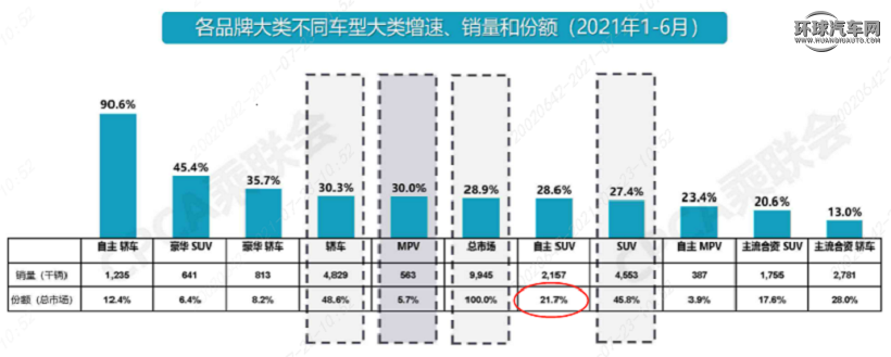 乘聯(lián)會數(shù)據(jù)顯示,今年上半年,自主SUV累計銷售215.7萬輛,占據(jù)國內(nèi)21.7%的市場份額,僅次于主流合資轎車,成為國內(nèi)第二大細分市場。