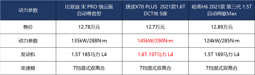 捷途X70 PLUS和第三代哈弗H6都提供兩款發(fā)動機給用戶選擇,而第二代宋Pro雖然全系都搭載1.5T發(fā)動機,但是不同版型采用不同的功率調(diào)校。