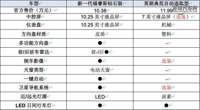 此次對比的新一代福睿斯鉆石版在力所能及的范圍內(nèi),不僅在安全性上全方位配備了6安全氣囊/氣簾,像電動天窗、倒車影像、一鍵啟動、車窗一鍵升降等日常常用的配置一個不少;特別是LED大燈/日間行車燈的使用,不僅讓外觀更加時尚,近光850lm/遠(yuǎn)光1,400lm的高亮度,還為夜間行車提升了安全系數(shù)。而英朗典范自動進(jìn)取型即便比新一代福睿斯鉆石版售價高出1.61萬元,也只是用了鹵素大燈,不說連倒車?yán)走_(dá)、電動天窗、車窗一鍵升降這種基礎(chǔ)配置都沒有,倒車影像、7英寸的中控液晶屏等功能都需要選裝。
