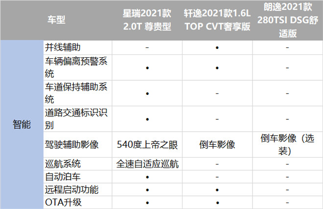 其次,智能配置與汽車的使用直接相關(guān),不僅能極大提升駕駛感受,還能讓人切實體驗到先進科技在操控上的應(yīng)用。讓人頗感意外的是,三款車型中價格最低的星瑞,反而智能配置最為齊全,達到了L2級別的自動駕駛,還擁有540度“上帝之眼”駕駛輔助系統(tǒng),更值得稱贊的是,星瑞還是首個實現(xiàn)整車OTA的燃油車,讓用戶可以享受到如同智能手機一樣常用常新的時尚科技體驗,絕對是這個價格區(qū)間實惠的優(yōu)秀家轎代表了,而軒逸和朗逸在智能配置方面就略有不足了,尤其是朗逸,倒車影像還需要選裝。