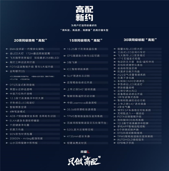此次,帝豪L作為帝豪家族的高端轎車,“只做高配”絕不只是配置上的高,更多是“高配”的產品價值標準和追求“高配”的造車態度,力求工藝、材質、品質、科技等多個方面達到同級領先的產品價值優勢。