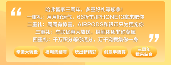 讓顧先生沒想到的是,這幾天哈弗智家APP舉辦三周年慶典活動,注冊成為用戶就有機會贏取66折購車權(quán)、iPhone13、AirPods耳機、紀(jì)念銀幣等好禮。“想不到一抽就中了一副耳機,看來之前參加車友群的活動沒白費哈哈哈哈。”不僅產(chǎn)品力強勁,還這么關(guān)愛車主,與用戶玩在一起,這樣的哈弗初戀你還不趁優(yōu)惠入手一臺?