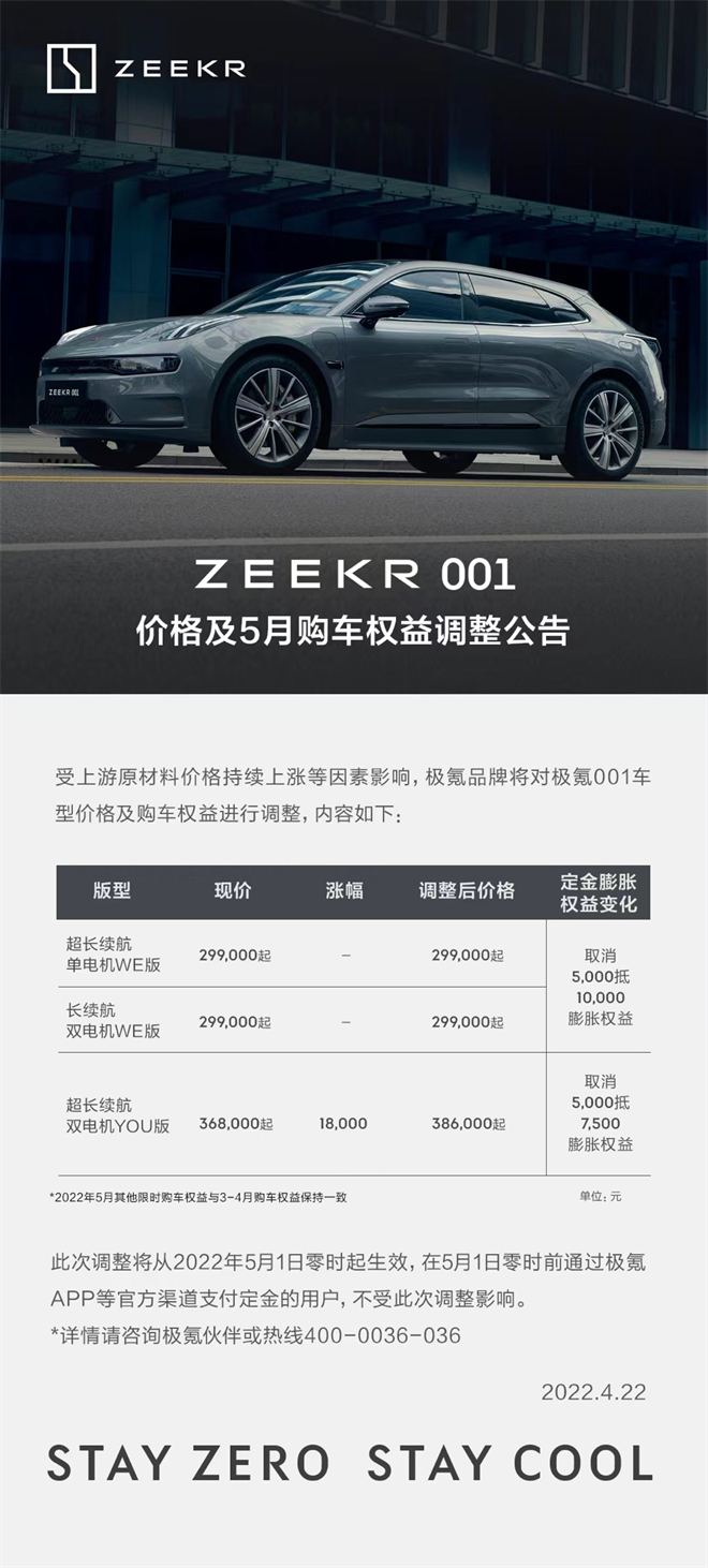 在充分考慮用戶利益,盡最大可能消化成本壓力后,極氪決定對極氪001車型價格及購車權益進行調整,具體方案如下:
