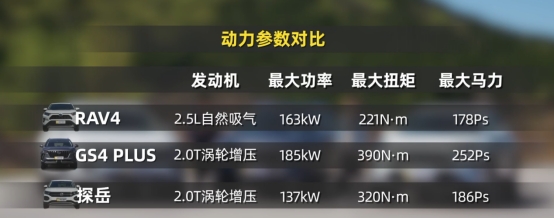 小編從數(shù)值上看到,一汽大眾探岳的2.0T發(fā)動機額定功率為131 kW/rpm,傳祺GS4 PLUS同樣也是2.0T發(fā)動機,其額定功率為185 kW/rpm,而榮放RAV4雙擎版采用2.5L自然吸氣的發(fā)動機,額定功率則為163 kW/rpm。從官方數(shù)值上來說,似乎傳祺GS4 PLUS在動力上會更出色,那實際開起來如何呢?