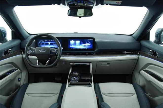 福特領睿內飾有單色和黑白拼色,布局簡約干凈;采用雙12.3英寸一體式智聯屏,懸浮設計,造型規整,搭配平底方向盤,顯得非常簡潔,沒有過多的裝飾讓車內看起來很通透。