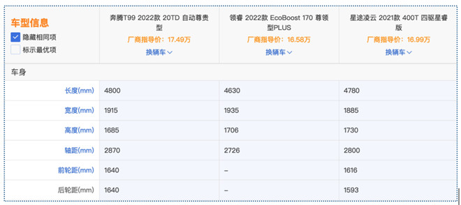 如果以16萬左右的價格作為預算買SUV,放在從前,市面主流產量都集中在緊湊型的級別,但近幾年隨著競爭越來越激烈,不少打破級別局限的中型SUV將價格下探,以更龐大的體型更高的品質,形成“降維打擊”,無疑,對于追求“大車”的消費者來說相當友好。今天我們就對比三款中型SUV奔騰T99 20TD 自動尊享型、福特領睿EcoBoost 170尊領型PLUS、星途凌云400T四驅星瑞版,看看在16萬左右(經銷商參考價)的價格,怎么買質價比最高。