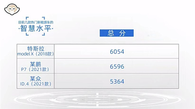 同時,魯大師還展示了一下目前幾款熱門新能源汽車(特斯拉ModelX 2018款、小鵬P7 2021款、以及大眾ID.4 2021款)的智慧水平橫向對比,以下為最終得分情況: