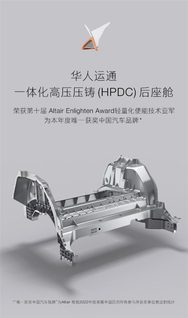2022年8 月2 日,Altair隆重揭曉第十屆年度Altair Enlighten Award獲獎(jiǎng)名單,華人運(yùn)通一體化高壓壓鑄(High Pressure Die Casting,HPDC) 后座艙通過(guò)兼具開創(chuàng)性和可持續(xù)性的鑄造技術(shù),榮獲第十屆Altair Enlighten Award輕量化使能技術(shù)獎(jiǎng)項(xiàng),成為本年度唯一獲獎(jiǎng)的中國(guó)汽車品牌。