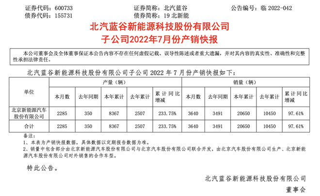 8月4日,北汽藍谷官方發布最新銷量數據。據數據顯示,2022年7月,北汽藍谷實現銷量3640臺,同比增長4.27%,市場預期持續向好。