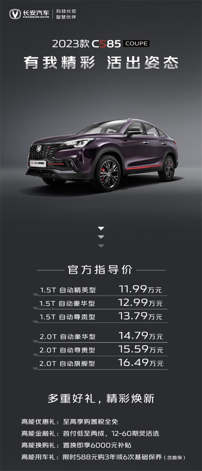 9月19日,長安汽車2023款CS85 COUPE正式上市,新車共推出6款車型,售價11.99-16.49萬元,同時推出高能優惠禮:至高享購置稅全免;高能金融禮:首付低至兩成,12-60期靈活選;高能換購禮:置換即享6000元補貼;高能用車禮:限時588元購3年或6次基礎保養(含首保)。2023款CS85 COUPE搭載藍鯨新一代NE1.5T高壓直噴發動機及藍鯨2.0T發動機,動力表現更出色。同時,還采用全新黑色碳纖維后視鏡及紅色卡鉗,并在車機系統等方面都有不同程度升級,為不甘平庸的都市潮流新中產不斷賦能。