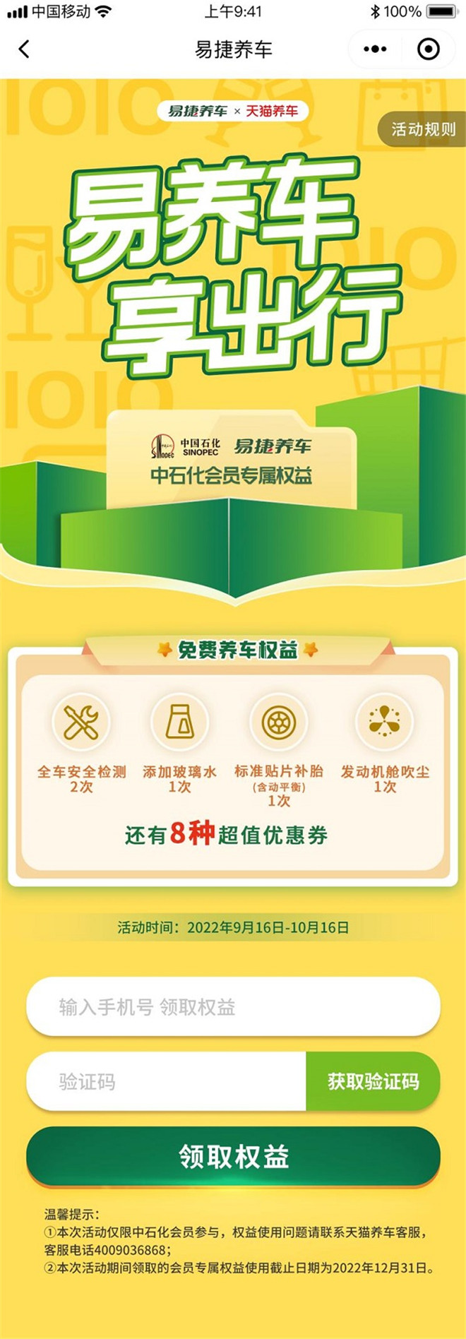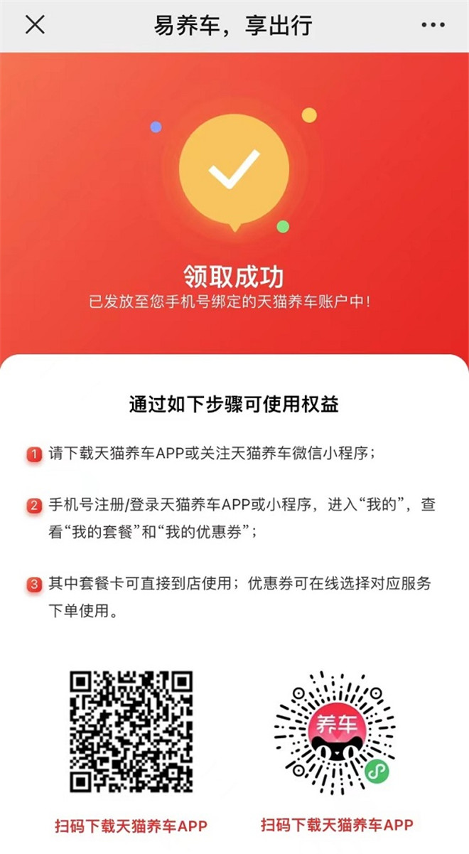 中石化易享節(jié)期間參與聯(lián)合活動的注冊會員用戶,需要在“天貓養(yǎng)車專享權(quán)益包”界面點擊“立即領取”,跳轉(zhuǎn)至“天貓養(yǎng)車”領取引導鏈接中,在該頁面完成領券后,按照提示在天貓養(yǎng)車APP或微信小程序下單,選擇門店及核銷。