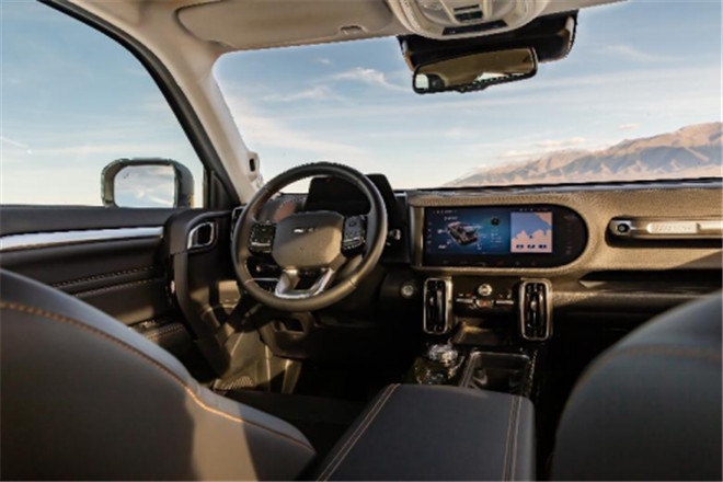 進入到車內,哈弗大狗追獵版要更加偏向年輕與時尚的風格,并且整體的做工用料在同級別中也比較厚道,副駕前方和車窗位置設立了粗壯的扶手,營造出濃厚的越野氣息。當然,在智能化方面哈弗大狗追獵版也表現出眾,搭載10.25英寸全液晶儀表和12.3英寸中控屏,并配有人臉識別、循跡導航、遙控泊車和智能清潔座艙等科技配置。