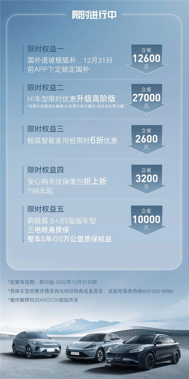 作為中國高端智能新能源格局引領者,極狐汽車以用戶需求為驅(qū)動力,堅持人本科技、先鋒美學、至臻品質(zhì)、極致體驗的品牌價值,致力于為用戶提供極致用車體驗。此次針對消費者痛點,極狐汽車宣布“國補退坡極狐補”,消費者在12月31日前選購極狐產(chǎn)品,即省12600元;同時極狐汽車更額外帶來多重限時權(quán)益,用戶根據(jù)不同車型還可最高享2.7萬元的升級權(quán)益!