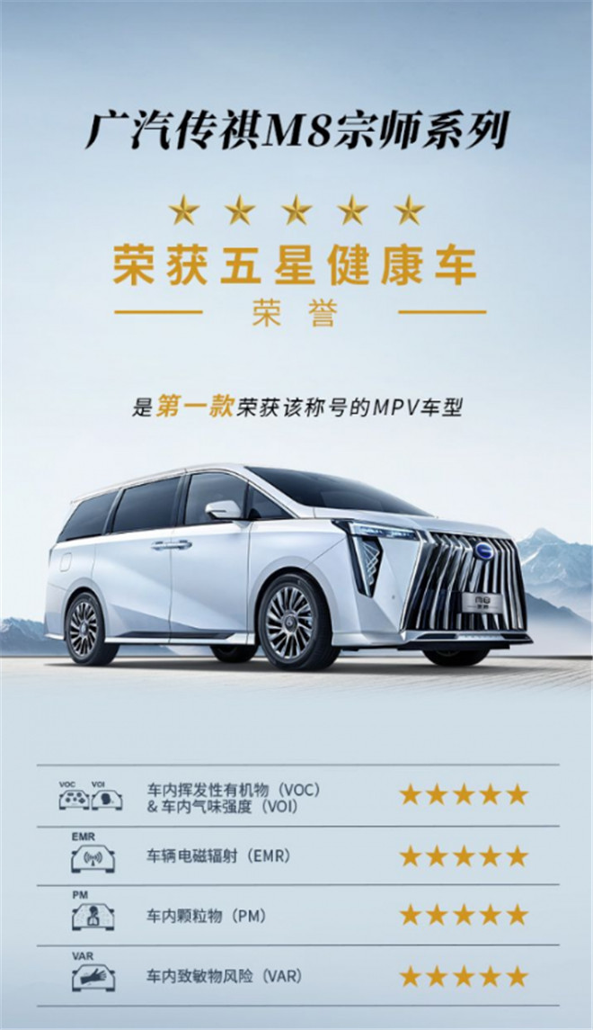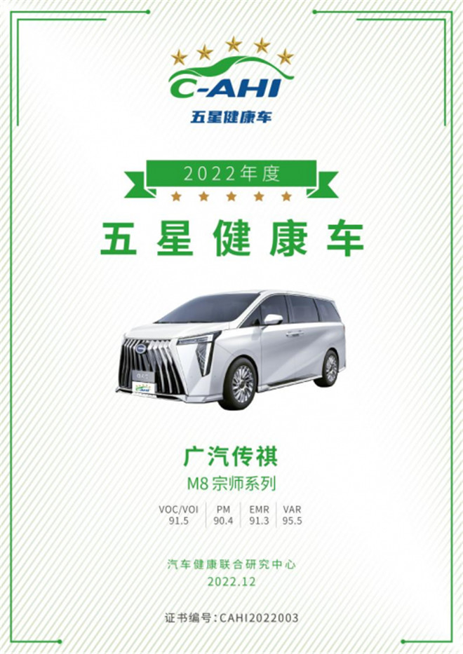 12月10日,廣汽傳祺M8宗師系列獲得由汽車健康聯(lián)合研究中心頒發(fā)“五星健康車”獎(jiǎng)項(xiàng)。該研究中心是由中國(guó)汽研、中國(guó)室內(nèi)空氣凈化品牌集群(鐘南山院士任主席)、廣東省室內(nèi)環(huán)境衛(wèi)生行業(yè)協(xié)會(huì)(鐘南山院士任榮譽(yù)會(huì)長(zhǎng))三方共建的行業(yè)權(quán)威機(jī)構(gòu),其中“五星健康車”是由三方共建的汽車健康聯(lián)合研究中心基于中國(guó)汽車健康測(cè)評(píng)指數(shù)(C-AHI)結(jié)果頒發(fā)的榮譽(yù)稱號(hào),也是目前國(guó)內(nèi)汽車市場(chǎng)中的健康乘用車榮譽(yù)形象,相當(dāng)于是汽車的“健康碼”。