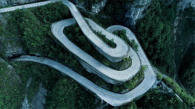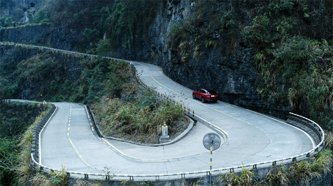 張家界天門山被譽為“亞洲第一天路”,全長10.77公里,海拔落差1100米,密布99道臨崖急彎。山路蜿蜒,加上高海拔云霧彌漫。受限的視野,夸張的坡度,側身可見的百丈懸崖。在這樣的道路上進行駕駛挑戰,一次失誤便足以造成令人難以直視的慘劇。