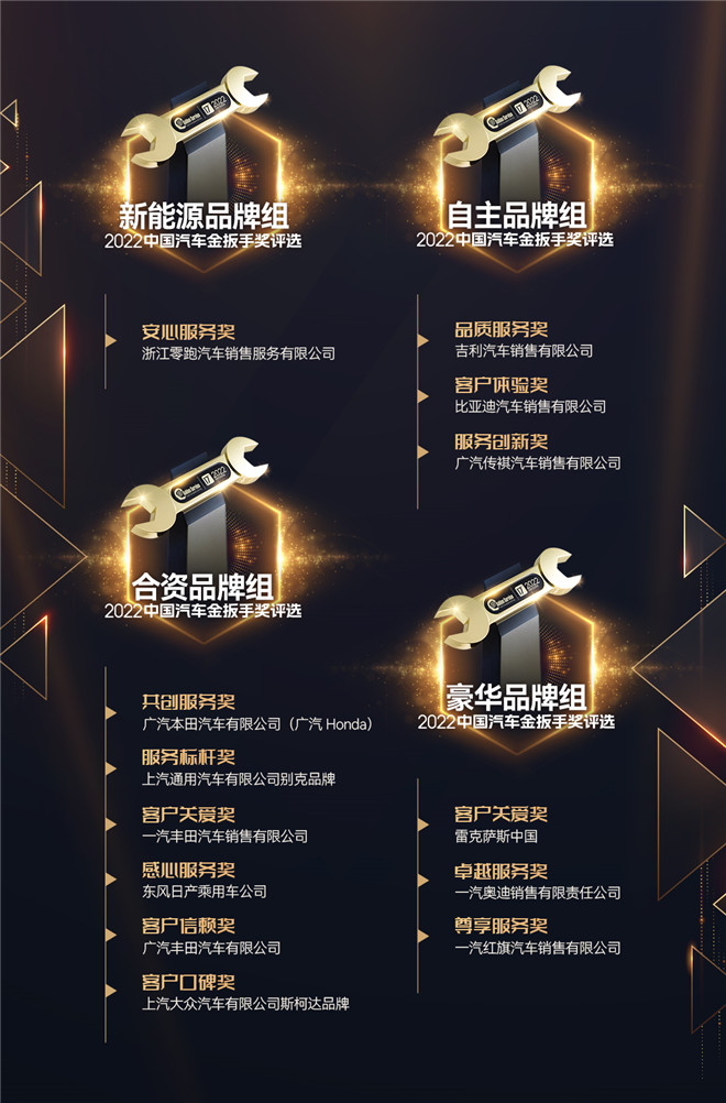 中國(guó)汽車(chē)金扳手獎(jiǎng),是國(guó)內(nèi)率先由媒體機(jī)構(gòu)發(fā)起并主辦、深度關(guān)注并評(píng)價(jià)國(guó)內(nèi)乘用車(chē)服務(wù)品牌的專(zhuān)業(yè)評(píng)選,至今已走過(guò)十七載。2022(第十七屆)中國(guó)汽車(chē)金扳手獎(jiǎng)評(píng)選,繼續(xù)匯聚本年度中國(guó)汽車(chē)服務(wù)領(lǐng)域的最高水準(zhǔn)和主流力量,以用戶(hù)滿(mǎn)意為評(píng)價(jià)核心,全方位評(píng)審過(guò)去一年來(lái)中國(guó)主流汽車(chē)企業(yè)及品牌在汽車(chē)服務(wù)領(lǐng)域的綜合表現(xiàn)。