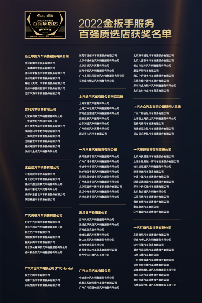 為了樹(shù)立品牌服務(wù)標(biāo)桿榜樣,協(xié)同提升汽車(chē)服務(wù)質(zhì)量,促進(jìn)良好市場(chǎng)環(huán)境,主辦方特別舉辦了2022金扳手服務(wù)全國(guó)百?gòu)?qiáng)質(zhì)選店評(píng)選活動(dòng),該評(píng)選由中國(guó)汽車(chē)維修行業(yè)協(xié)會(huì)指導(dǎo),依據(jù)金扳手GES-150服務(wù)評(píng)價(jià)標(biāo)準(zhǔn)和《放心汽修認(rèn)證》團(tuán)體標(biāo)準(zhǔn),對(duì)候選經(jīng)銷(xiāo)商進(jìn)行專(zhuān)業(yè)評(píng)價(jià),最終共有12個(gè)品牌的全國(guó)100家經(jīng)銷(xiāo)商獲得“2022金扳手服務(wù)百?gòu)?qiáng)質(zhì)選店”榮譽(yù)稱(chēng)號(hào),他們代表了行業(yè)頂級(jí)水準(zhǔn)的“金扳手”服務(wù)。