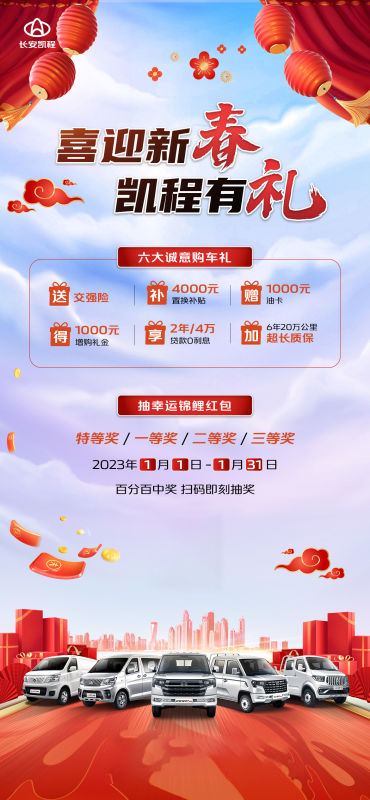 同時,自2023年1月1日起至1月31日止,長安凱程還發起“抽幸運錦鯉紅包”活動,點擊下方鏈接參與,贏取購車紅包,最高可得2023元,參與百分百中獎,多重驚喜等待各位創富者發現。