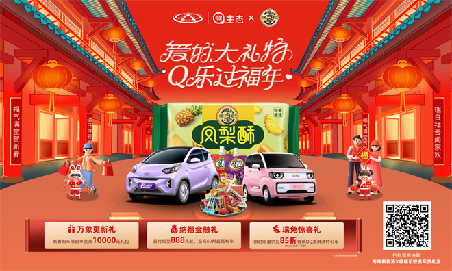 新春年貨季,奇瑞新能源X徐福記喜迎甜蜜官宣,通過爆款聯(lián)名年貨禮盒、線上H5有獎互動等玩法,打造國民爆款“CP”。更有奇瑞新能源新春大促活動,限時享至高萬元禮包、限時限量供應85折奇瑞QQ冰淇淋特價車等多重好禮,就等你參與!趕緊置備你的新春品質(zhì)“年貨”,一起Q樂過福年吧~