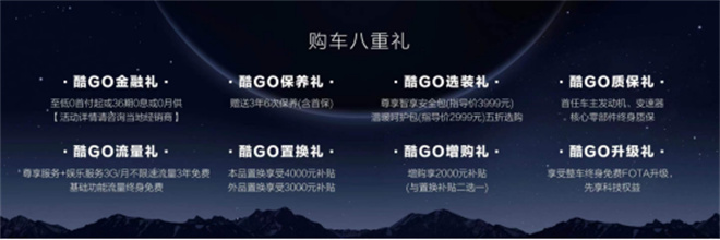 酷GO保養(yǎng)禮,前1萬(wàn)名下訂客戶贈(zèng)送3年6次保養(yǎng)(含首保);