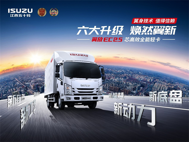 其中,藍牌輕卡江西五十鈴翼放EC 2.5輕卡,是在翼放輕卡的基礎上全面升級,以新動力、新底盤、新車架、新舒適、新智慧、新工藝這6新升級的產品優勢,滿足卡友對高品質、高性能的用車需求,讓卡友享受自由路權,進城配送不受限。