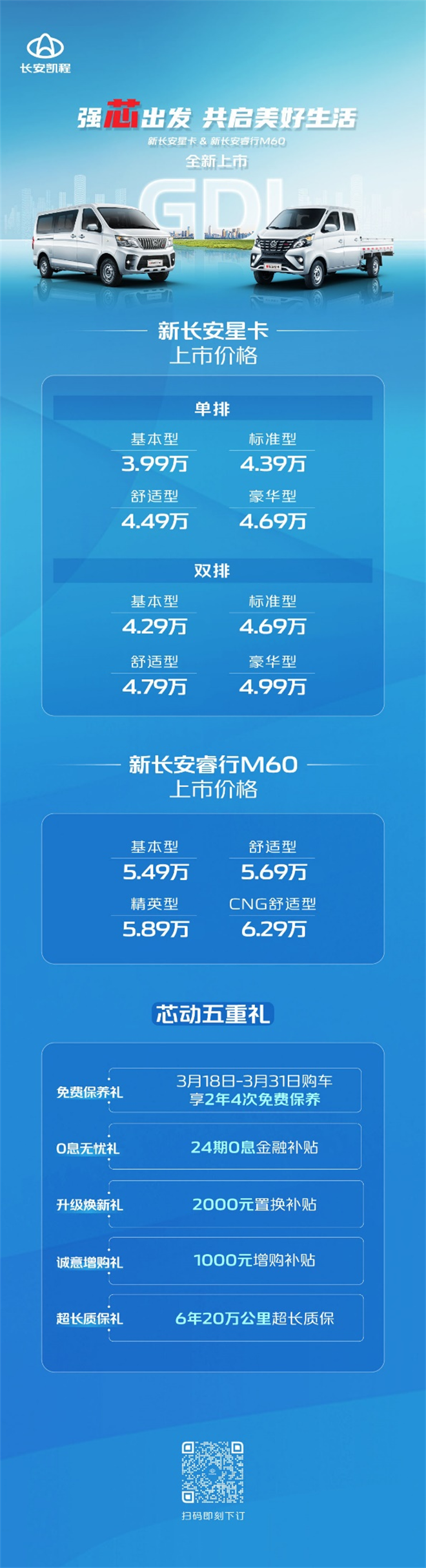 在創富者的矚目中,兩款新車正式上市。其中,新生代強動力微卡-新長安星卡官方指導價3.99萬元起,強動力寬體大微客-新長安睿行M60官方指導價5.49萬元起。