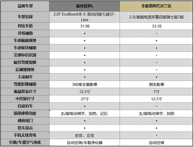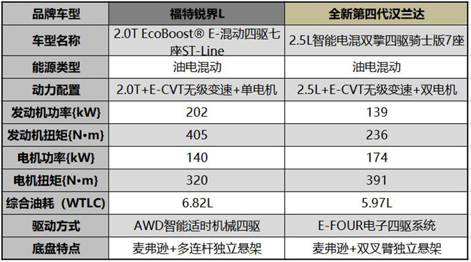 為此,我們遵循價格相近原則,選擇售價為31.98萬元的長安福特銳界L 2.0T EcoBoost E-混動四驅七座ST-Line(以下簡稱:銳界L),以及售價33.18萬元的豐田全新第四代漢蘭達2.5L智能電混雙擎四驅騎士版7座(以下簡稱:漢蘭達),看看到底誰更優秀!