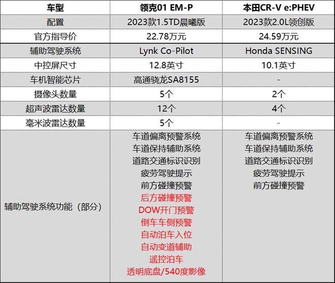 配置方面,兩車均搭載L2級智能駕駛輔助系統(tǒng)。不過,較領(lǐng)克01 EM-P集成27項功能的Lynk Co-Pilot智能駕駛輔助系統(tǒng),本田CR-V e:PHEV的Honda SENSING輔助駕駛系統(tǒng)顯然有點“偷功減料”。除此之外,領(lǐng)克01 EM-P還搭載了高清智控三聯(lián)屏,加之高通驍龍8155芯片。實用性和可玩性兼顧,駕控更智能、便捷。