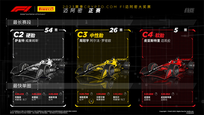 威廉姆斯車手洛根·薩金特,使用硬胎完成了最多圈數。他在第二圈就換上了硬胎,一直使用這套輪胎跑完比賽:總計使用這套胎完成54圈。阿爾法·羅密歐車隊的周冠宇,中性胎圈數最多,完成了26圈,而邁凱倫車隊的奧斯卡·皮亞斯特里則是軟胎圈數最多的車手,在起步后使用軟胎完成5圈。