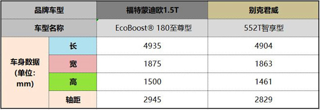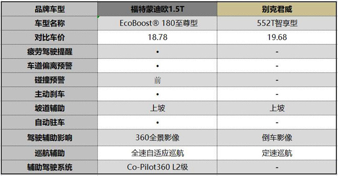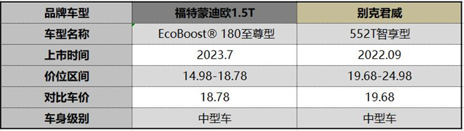 遵循價格相近原則,新一代蒙迪歐1.5T車型選擇售價18.78萬元的EcoBoost 180至尊型(以下簡稱:蒙迪歐1.5T),別克君威則是售價19.68萬元的552T智享型(以下簡稱:君威),且兩款車型均定位于中型轎車。不過,在價格相近的情況下,蒙迪歐1.5T是頂配版本,而別克君越則是入門級車型!