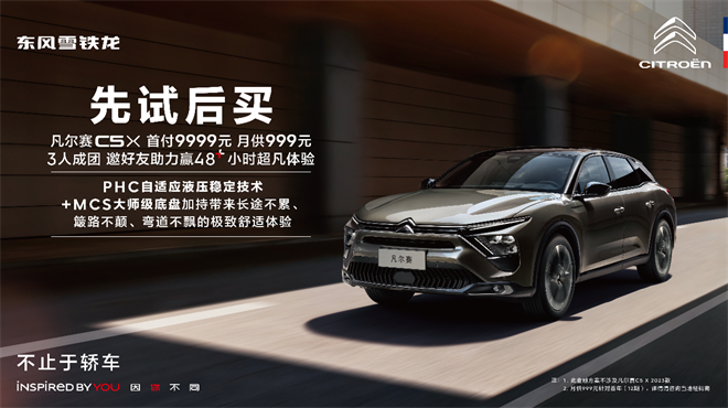 為讓客戶在購買產品之前有機會親身體驗,更好地評估東風雪鐵龍凡爾賽C5 X的品質、功能和適用性。近期,東風雪鐵龍針對旗下凡爾賽C5 X(不含2023款)推出“先試后買”福利政策,給予客戶48+小時超凡駕趣體驗,在將“以客戶為中心”落到實處的同時,更在與客戶的雙向奔赴中共創美好。福利“通關秘籍”拿好,下面就教你如何免費試用、優惠購買凡爾賽C5 X。