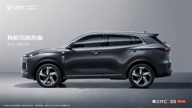 從側面看,第三代CS55PLUS依舊動感十足。鋒銳的線條切削車身型面,塑造出干練、完美的身姿,也彰顯了SUV的運動和力量感。同時,第三代CS55PLUS還采用車身色外包圍,上下車身色中間鑲嵌了一圈黑色,賦予全車科技感和紳士風度。搭配全新的低風阻刀鋒輪轂,與車身設計相得益彰,馳騁中將活力拉滿,動感十足。