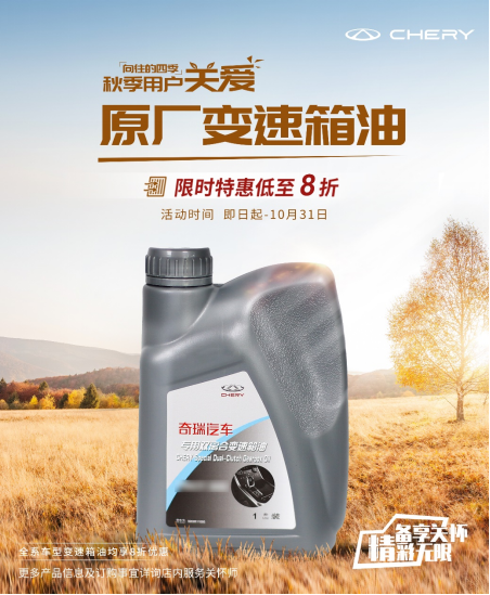 而在日常養護中,變速箱油不如汽車發動機油那么令人熟知,若長時間不更換變速箱油,會加速變速箱的內部零件磨損,縮短變速箱的使用壽命,正確的變速箱油更換周期應該為2年4萬公里。9月10日至10月31日,奇瑞為您所想,開展約“惠”金秋“油”禮同行變速箱油8折鉅惠限時搶購,快來參與活動吧!
