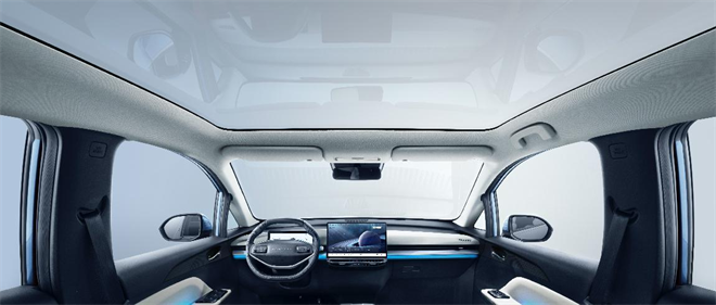 前擋風玻璃與全景天幕車頂無縫連接,形成“星鏡無界”一體式穹頂,猶如一整塊光潔深邃鏡面映照著璀璨星空,為科技感設(shè)計融入浪漫詩意。