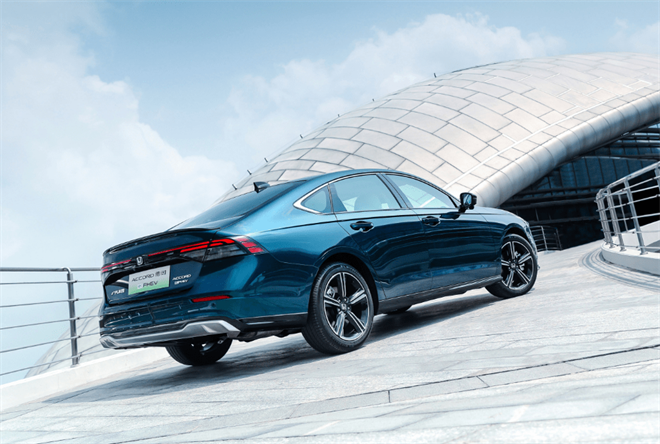 雅閣e:PHEV車型同樣是經(jīng)典家族式設(shè)計,延續(xù)了過去車型的風格,整體運動感稍強,前臉造型較為圓潤,車身線條感較弱,兩側(cè)大燈也呈現(xiàn)出圓潤立體感覺,與燃油版相比,外觀幾乎與其保持一致,沒有太大變化。