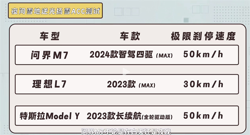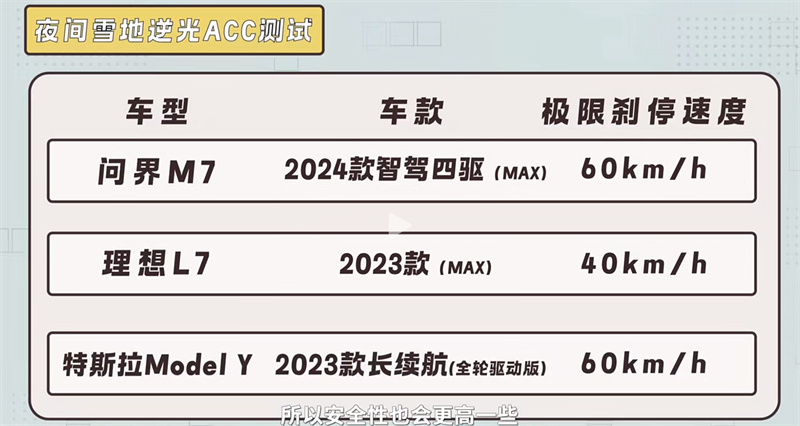 普通的日間AEB測試對三款車型考驗有限,為了能真正檢驗三款車型的極限條件下的主動安全能力,測試團隊增加了雪地下的ACC主動安全測試。理想L7分別通過了40km/h與50km/h測試,而特斯拉Model Y與問界新M7成績更好,通過了60km/h測試。其中問界新M7識別距離更遠,制動力度表現更柔和。