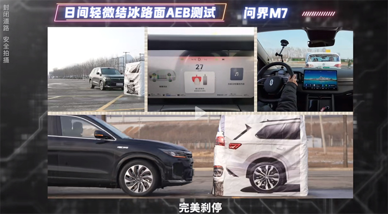 隨后登場的問界新M7表現穩定,分別順利通過30km/h與40km/h,系統識別駕車距離很遠,制動力度很線性。在后續50km/h的測試中,問界新M7表現依舊穩定,穩穩剎停順利通過測試。