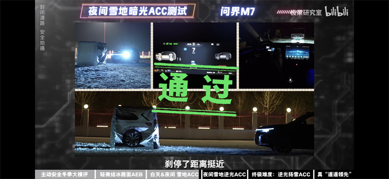 為了進一步考驗三款車型的極限性能,測試團隊加入了夜間雪地主動安全測試項目。夜晚光線較差再加上冬季低溫,對于車輛的主動安全性能有很大影響。雪地ACC測試項目中,理想L7、特斯拉Model Y與問界新M7均表現出色,分別通過了40km/h、50km/h與60km/h的測試。